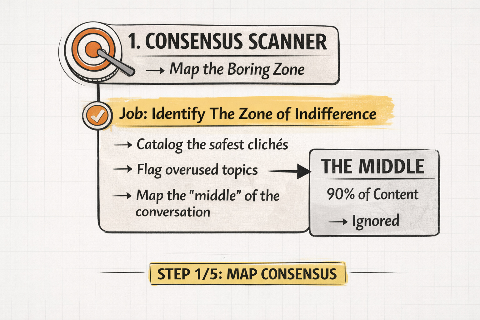 This prompt forces the AI to identify the Zone of Indifference…the crowded center where 90% of content lives and dies.